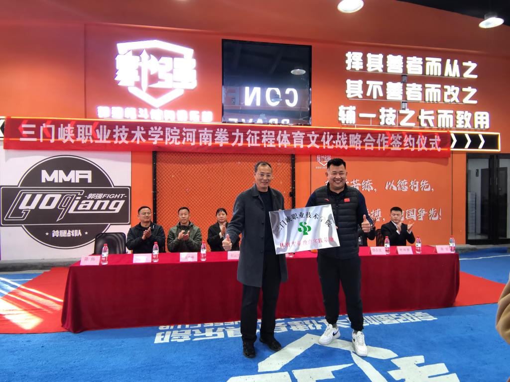 在和谐庄重的氛围下,双方签订了战略合作协议。曲扬院长和郭强董事长共同完成了“三门峡职业技术学院体育专业教育实践基地”牌匾交接。