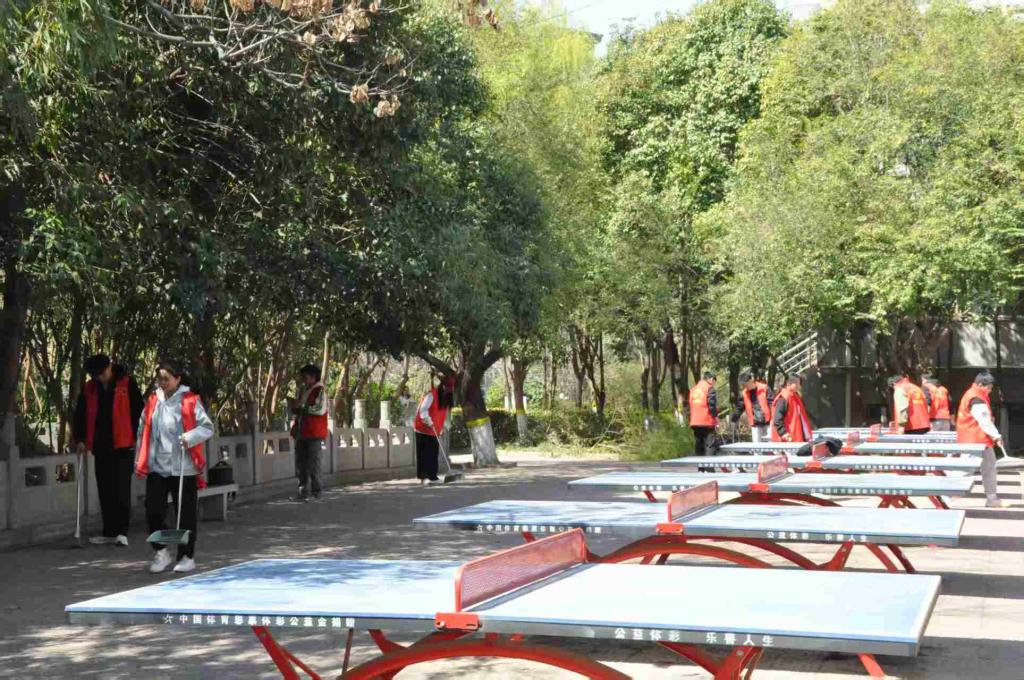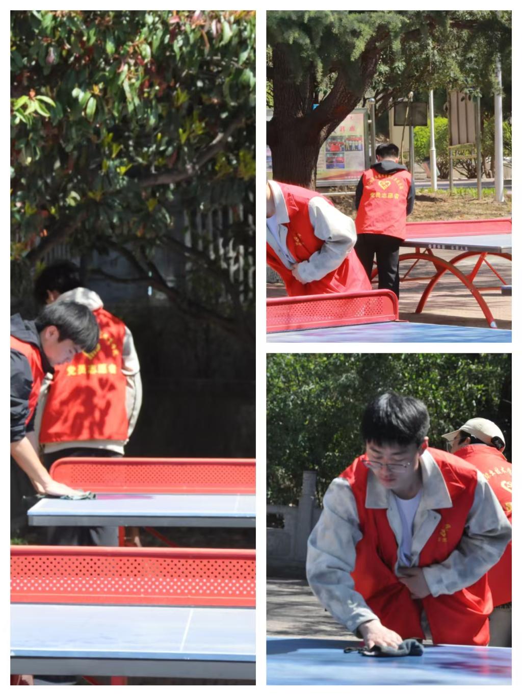 当天中午,志愿者们放弃午休,准时在三号教学楼后的乒乓球训练场集合。尽管大家来自不同年级和专业,但共同的目标让大家迅速熟络起来。三号教学楼后的乒乓球训练场因长期暴露在自然环境中,布满灰尘,杂物也随处可见。活动开始前,负责人进行了详细分工,有人负责清扫地面的灰尘和杂物,有人负责擦拭乒乓球桌和器材。分工完毕,志愿者们立即行动起来。负责扫地的同学手持扫帚,认真清扫着每一个角落,哪怕是藏在桌腿下的小纸屑也不放过,他们将垃圾一点点聚拢,再小心地扫进簸箕。擦拭乒乓球桌的同学则一丝不苟,先用湿布仔细擦去桌面上的污渍,再用干布擦干,经过他们的努力,原本有些灰尘的球桌变得光洁如新。在整个打扫过程中,志愿者们相互配合、相互支持。经过他们的辛勤劳动,乒乓球训练场焕然一新。地面干净整洁,球桌光亮可鉴,为同学们后续的训练创造了良好条件。