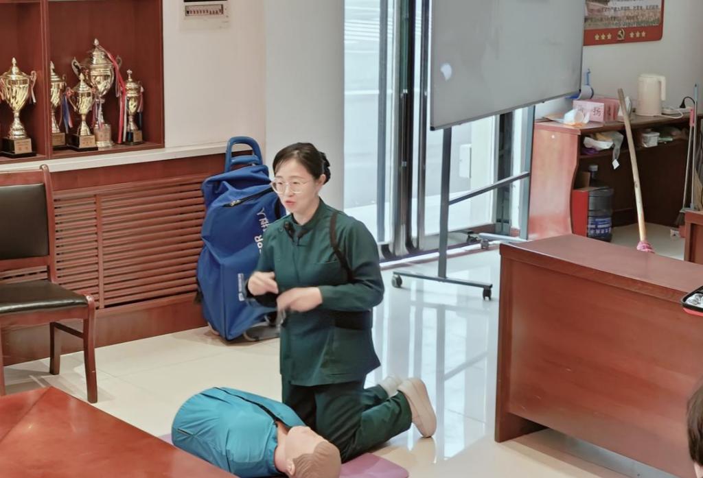 在实操环节,郝老师示范胸外按压、开放气道、人工呼吸等心肺复苏的关键操作步骤,并强调每个动作的规范要求和注意事项。老师们认真听讲,积极参与实践操作,现场学习氛围浓厚。
