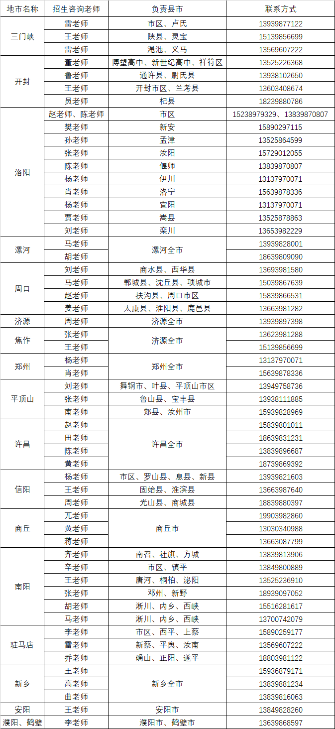三门峡职业技术学院2022年各地市招生咨询老师联系方式